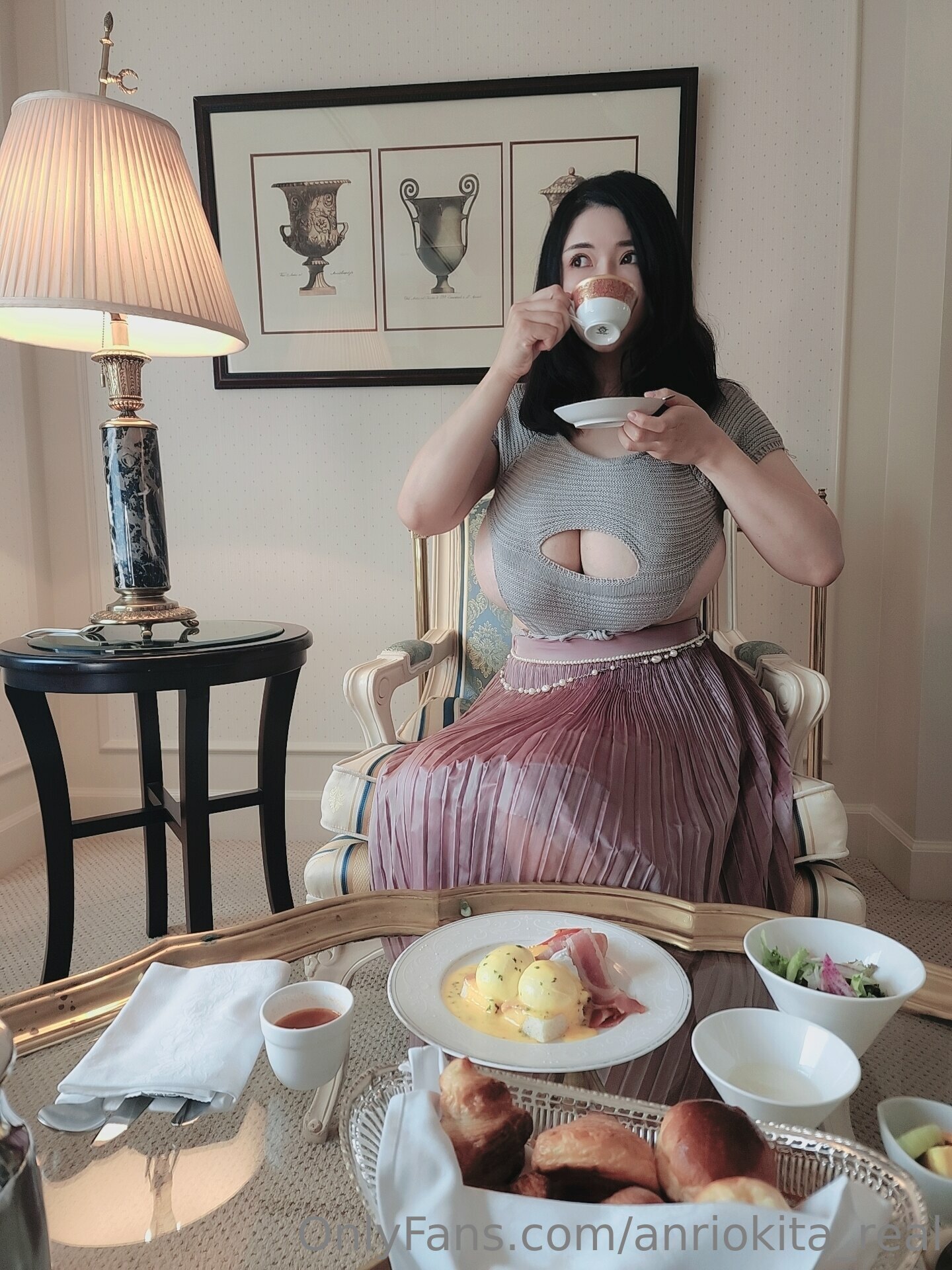 This is a photo set of Anri Okita having brunch meal then pour butter & cream on her nipples.